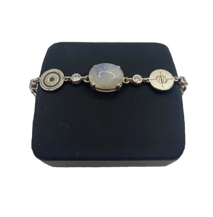 Kişiye Özel Doğum haritasına göre AstrodehA tarafından belirlenen semboller güneş ve şaman şans koruma sembollü Ay taşı gümüş bileklik.